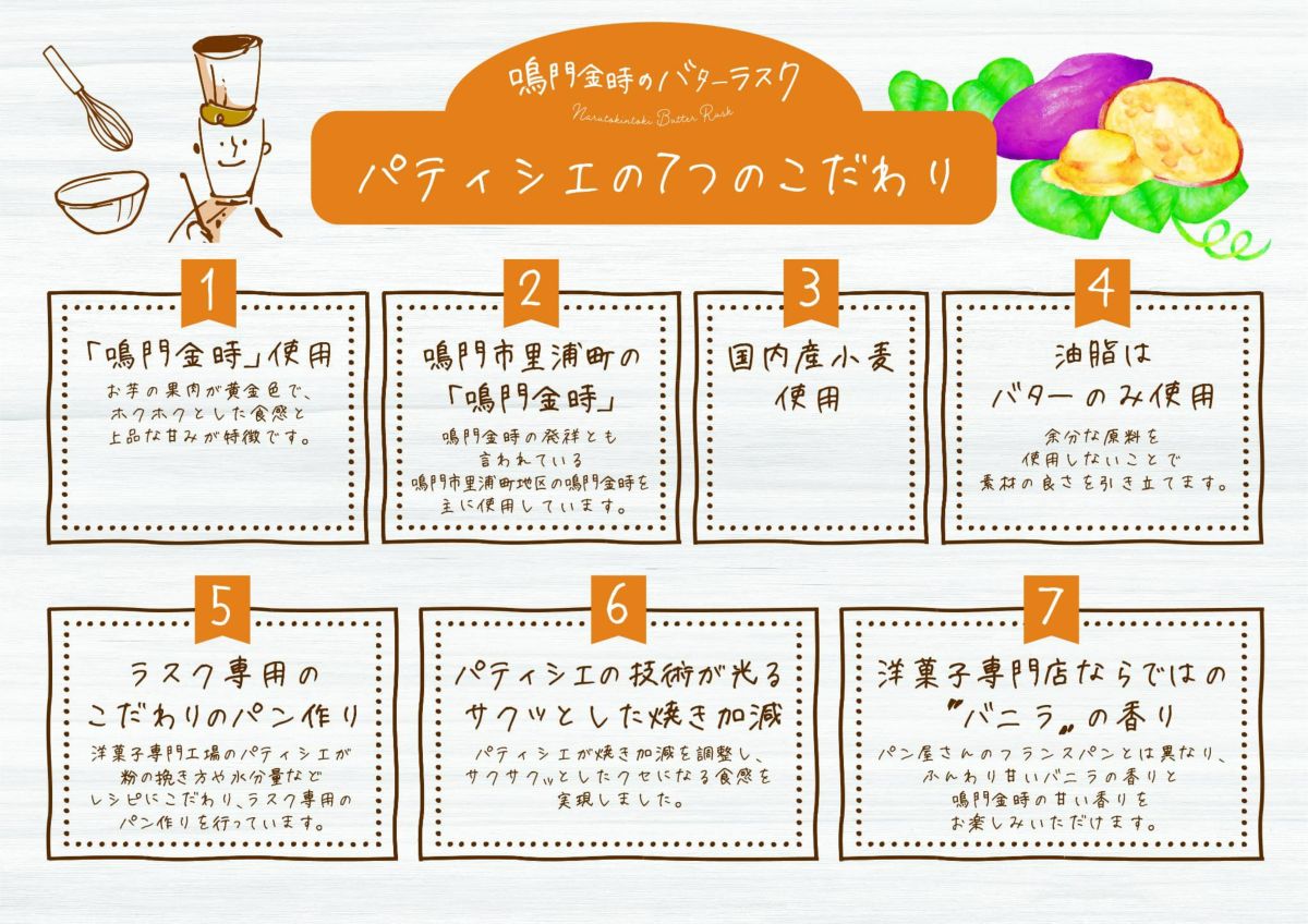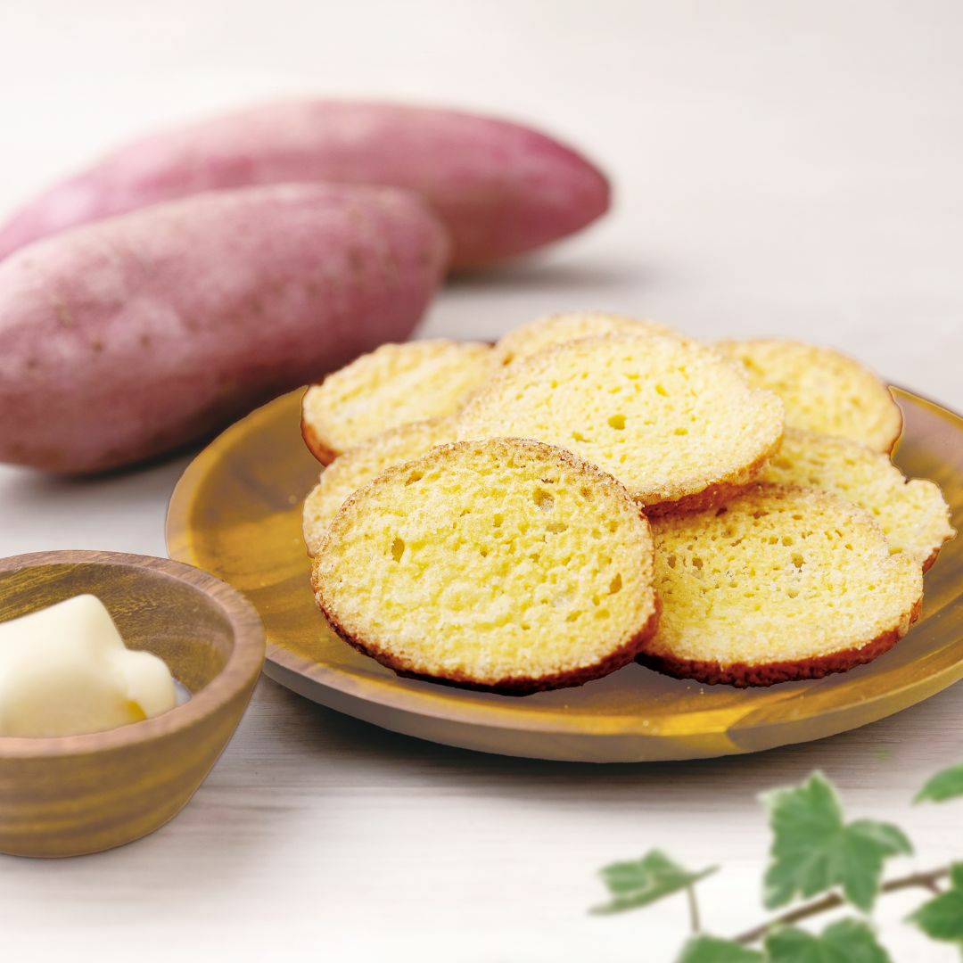 国内産小麦を使って上品な甘さが特徴の「鳴門金時」を100パーセント使用して作った深みのある甘さが特徴の「鳴門金時のバターラスク」です。